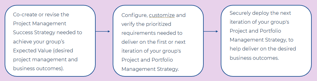 BrightWork will collaborate with your team using a defined process (using the "Configure-Verify-Adjust" steps below) to configure, customize and verify the prioritized requirements needed to deliver on the first or next iteration of your group's Project and Portfolio Management as called out in your Project Management Success Strategy.