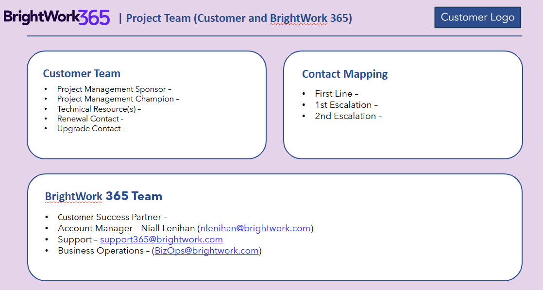- Schedule your next Project Management Success Review, with your BrightWork Customer Success Partner.