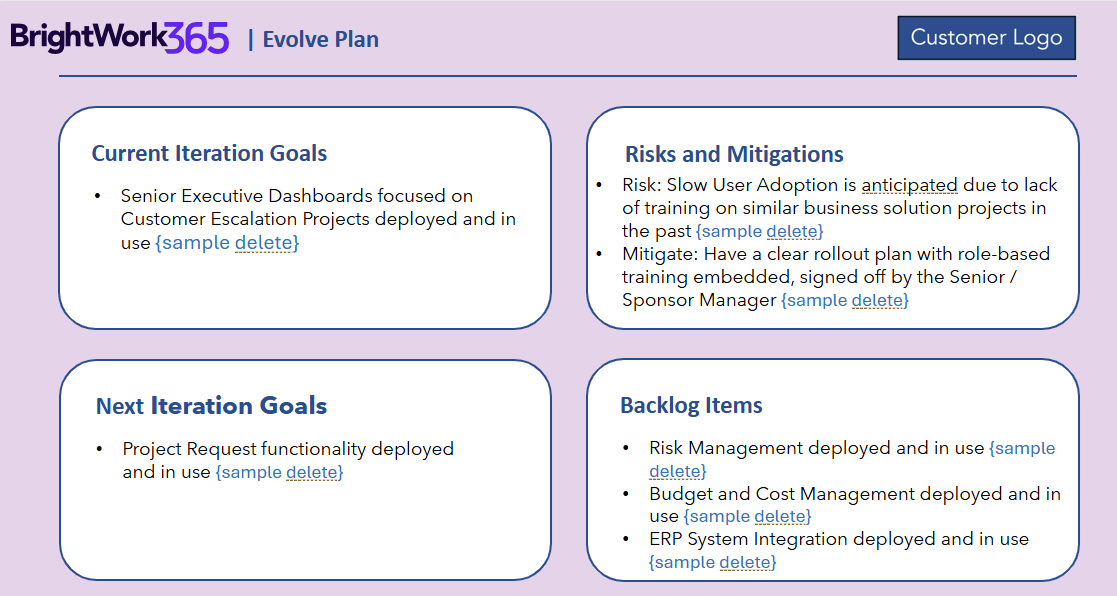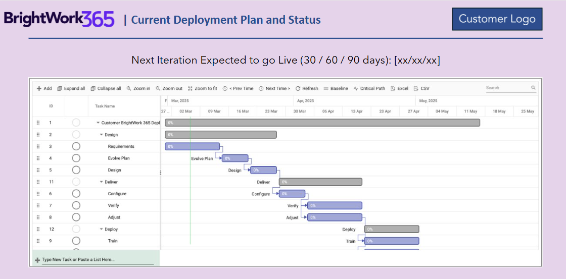 - You and your BrightWork Customer Success Partner will confirm all in-scope deliverables have been achieved for this iteration.