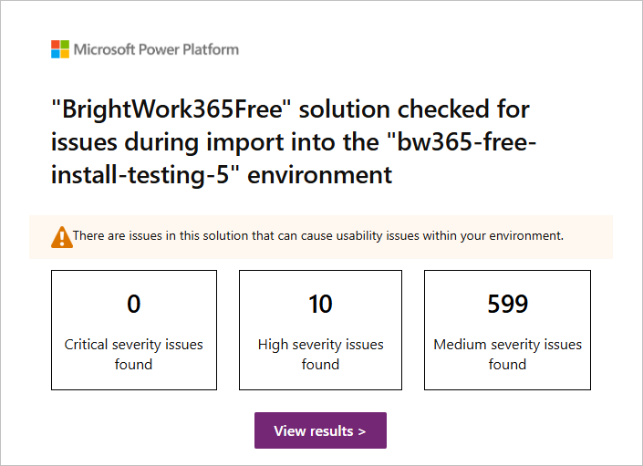 After installing BrightWork 365 Free, your Power Platform administrators may receive an email, with the subject 'Solution checked for issues during import', with the below information: