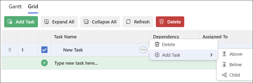 The Grid provides a simple, intuitive and quick interface for managing dependencies between tasks. They can be interacted with via inline keyboard inputs or menu-based changes. Dependency updates synchronize with the Gantt.