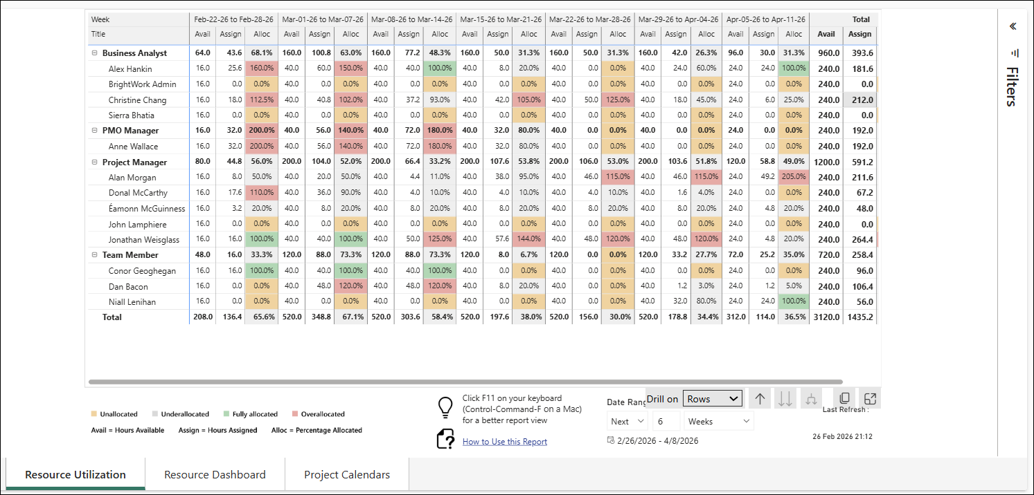 Microsoft Open in Power BI Service offers additional options to interact with BrightWork 365 reports. Users can conveniently access the service by clicking Open in Power BI on a BrightWork 365 Power BI dashboard page.