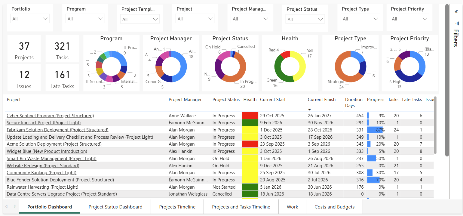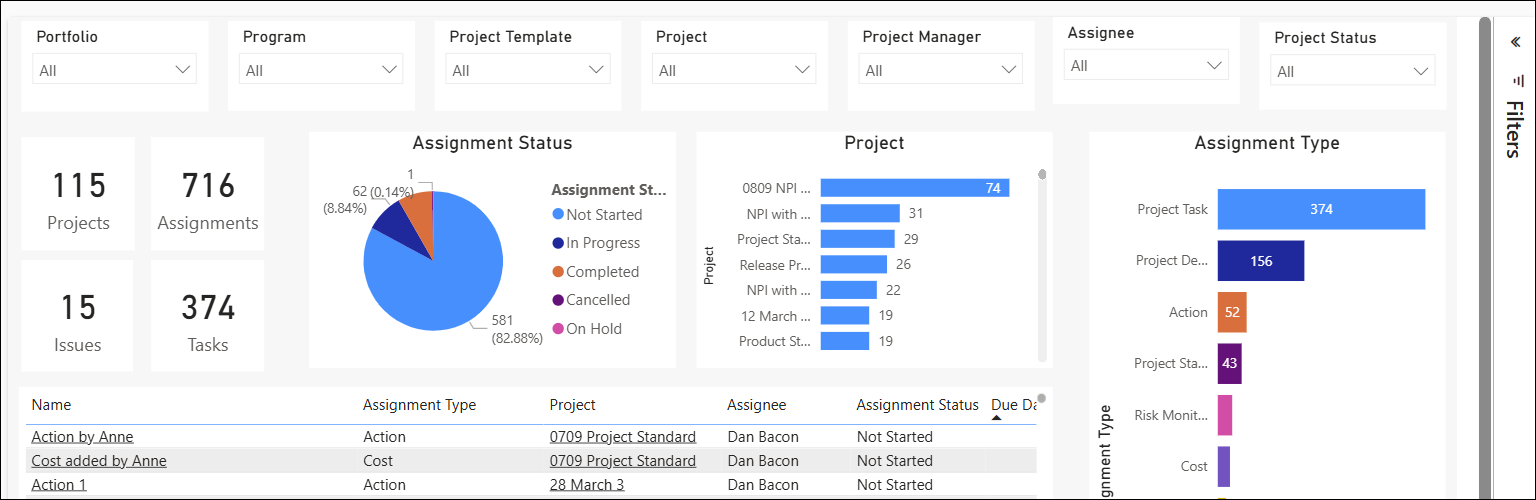 The Power BI dashboards include detailed interactive reports related to various elements of the system including Portfolios, Programs, Templates, Projects, and Project Managers. The report results can be narrowed down further by using Ctrl-Click to choose several chart objects or the checkboxes within an object, or with the Filters configuration options on the side of the screen.