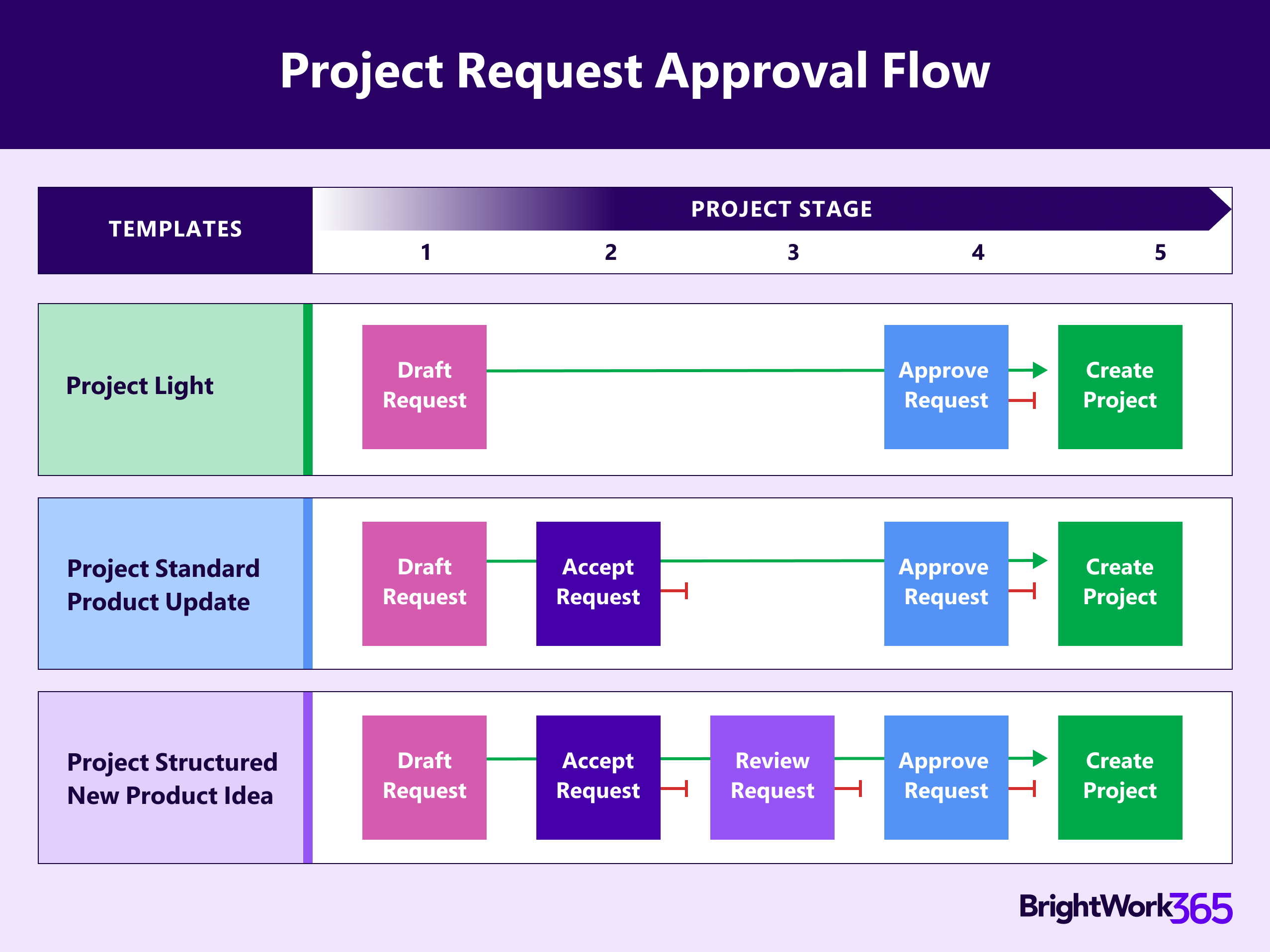 - BrightWork 365 ships with 5 starter Request Templates out of the box: Project Light, Project Standard, Project Structured, New Product Idea, and Product Update. For details about the Project Templates these Request Templates are associated with, see the BrightWork 365 Starter Project Templates article.