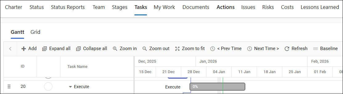 BrightWork 365 makes it easy to plan and execute your project tasks by splitting the management of tasks into two separate, but integrated and synchronized sections: Grid and Gantt. This article focuses on the Gantt, which provides a quick and easy method for entering project tasks along with a graphical representation of the schedule.